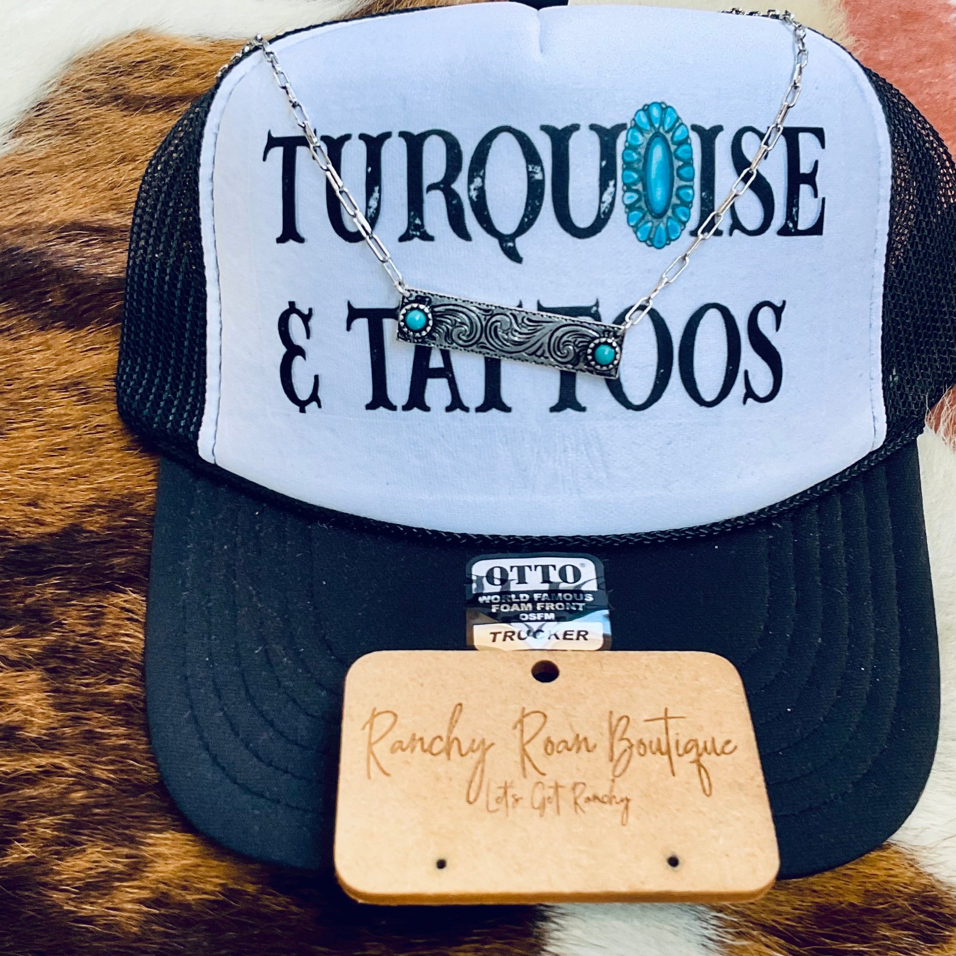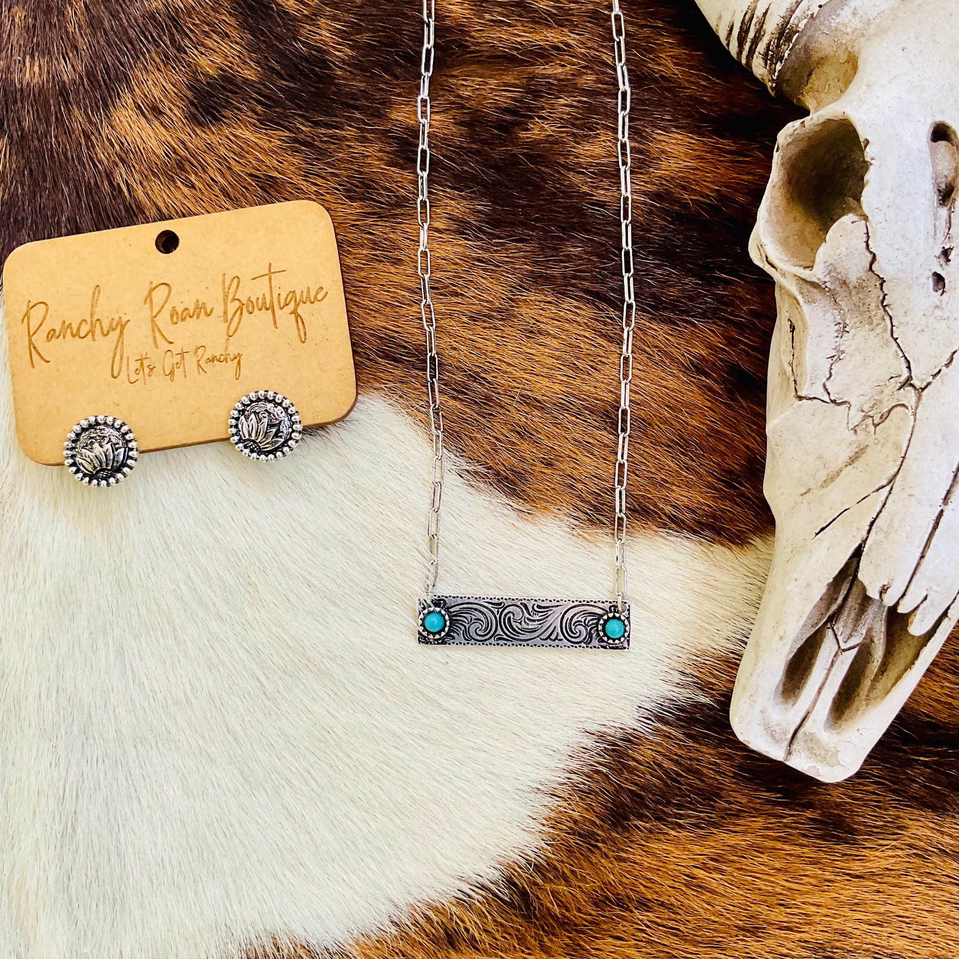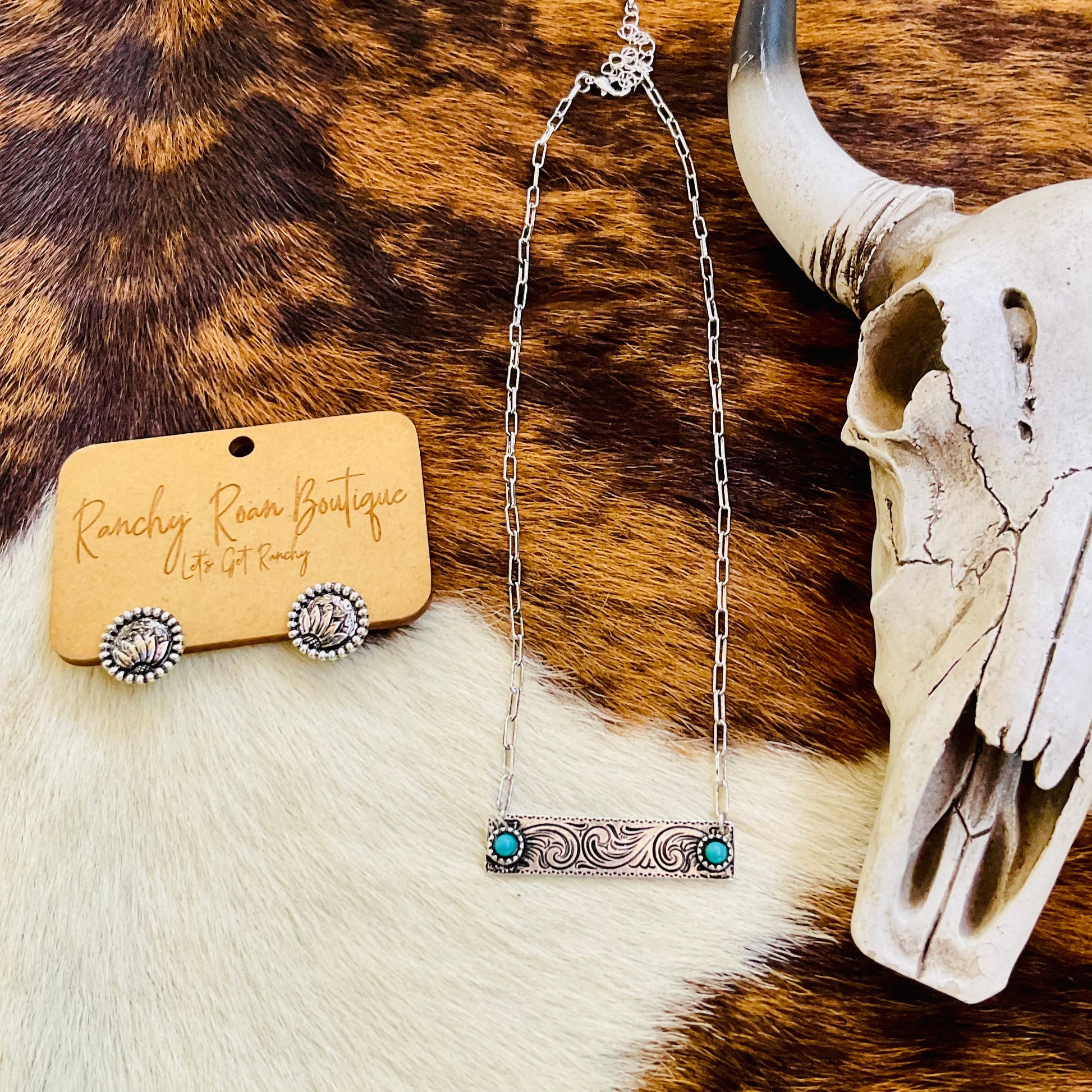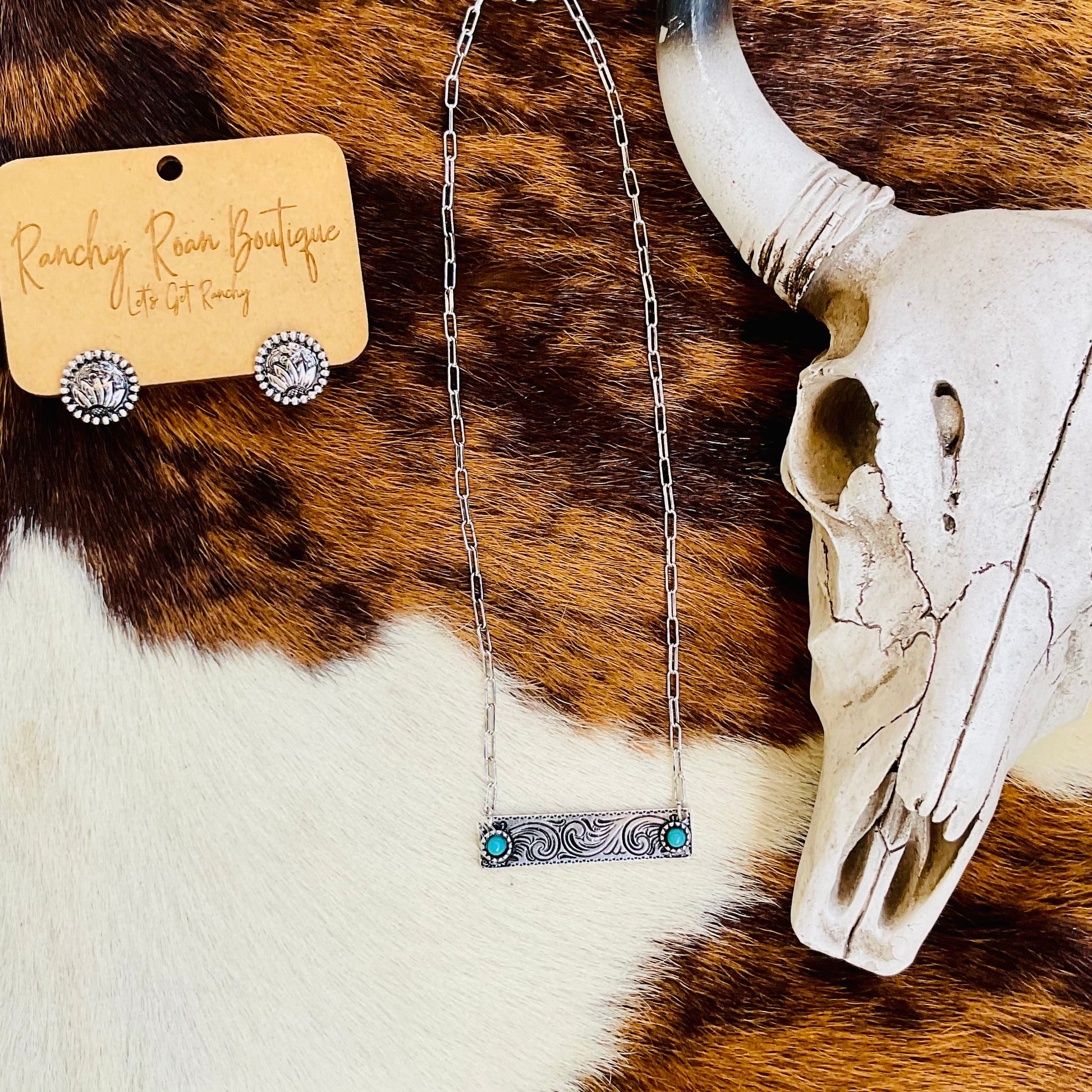 The Western Etched Stone Bar Necklace is a perfect mix of rustic elegance and modern cowgirl style. Featuring intricate Western scrollwork, burnished silver detailing, and turquoise-colored stone accents, this necklace is a stunning statement piece for any boutique. The adjustable chain allows for a customized fit, making it a versatile addition to any Western-inspired jewelry collection.