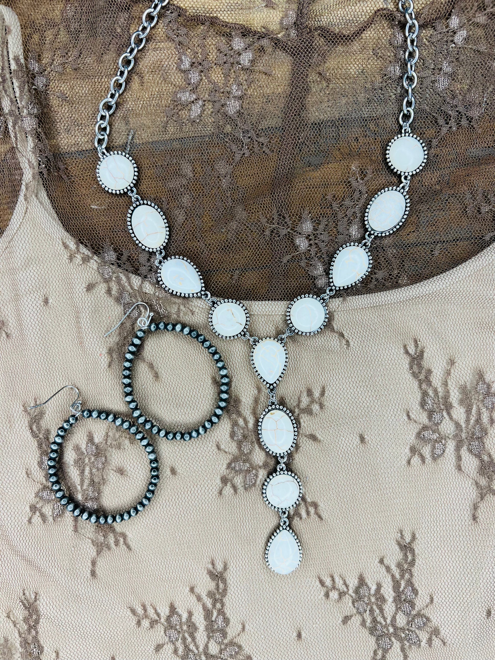The White Turquoise Concho Necklace features a 9" chain with a 3" turquoise drop, set on a burnished silver base. This statement piece exudes western charm with its unique design and expert craftsmanship. Add it to your collection for a touch of elegance and authenticity.