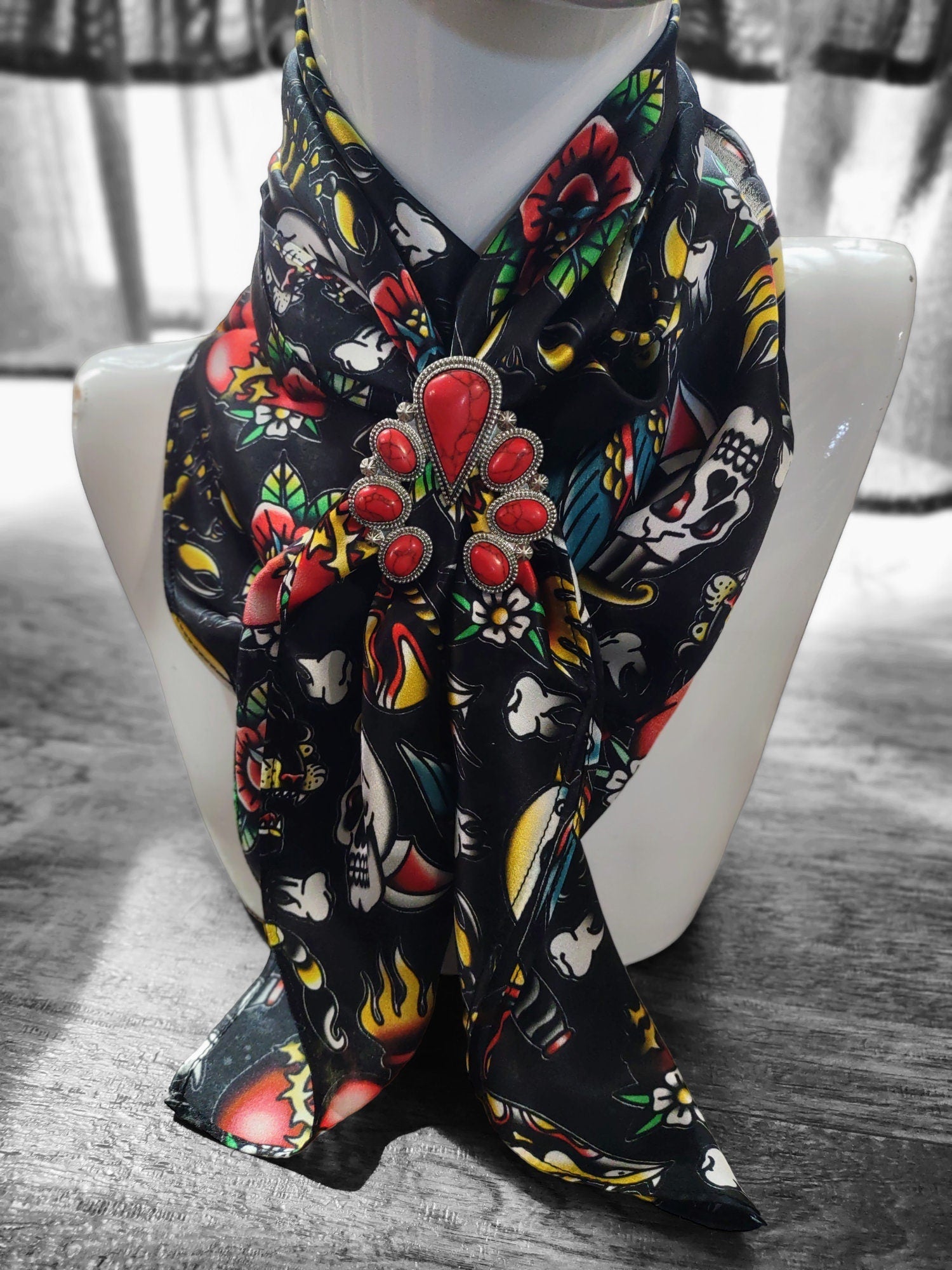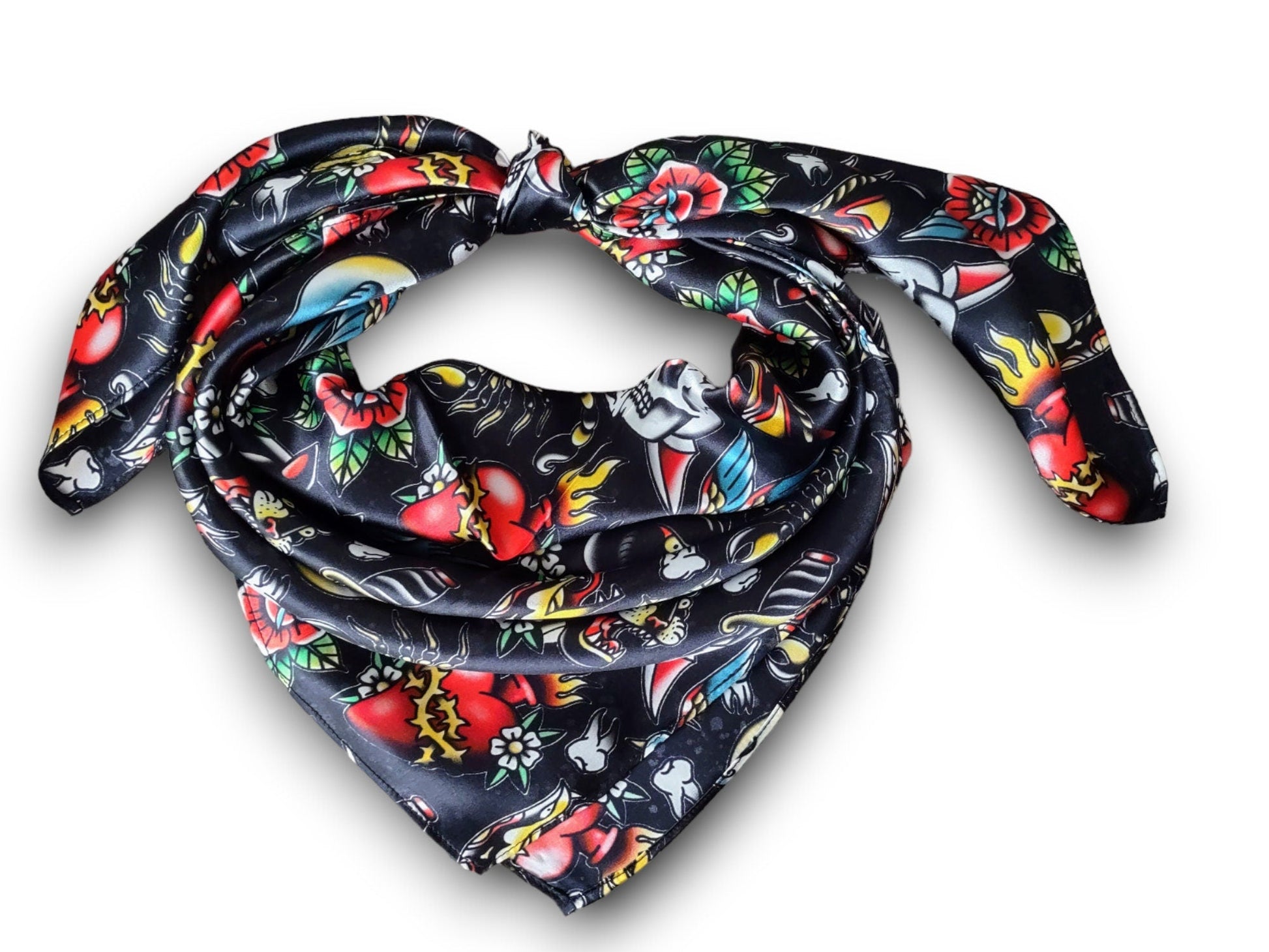 Wild Rag 100% SILK Black with Classic Tattoos Cowboy Western Neck Scarf Bandanna by Double B Wild Rags