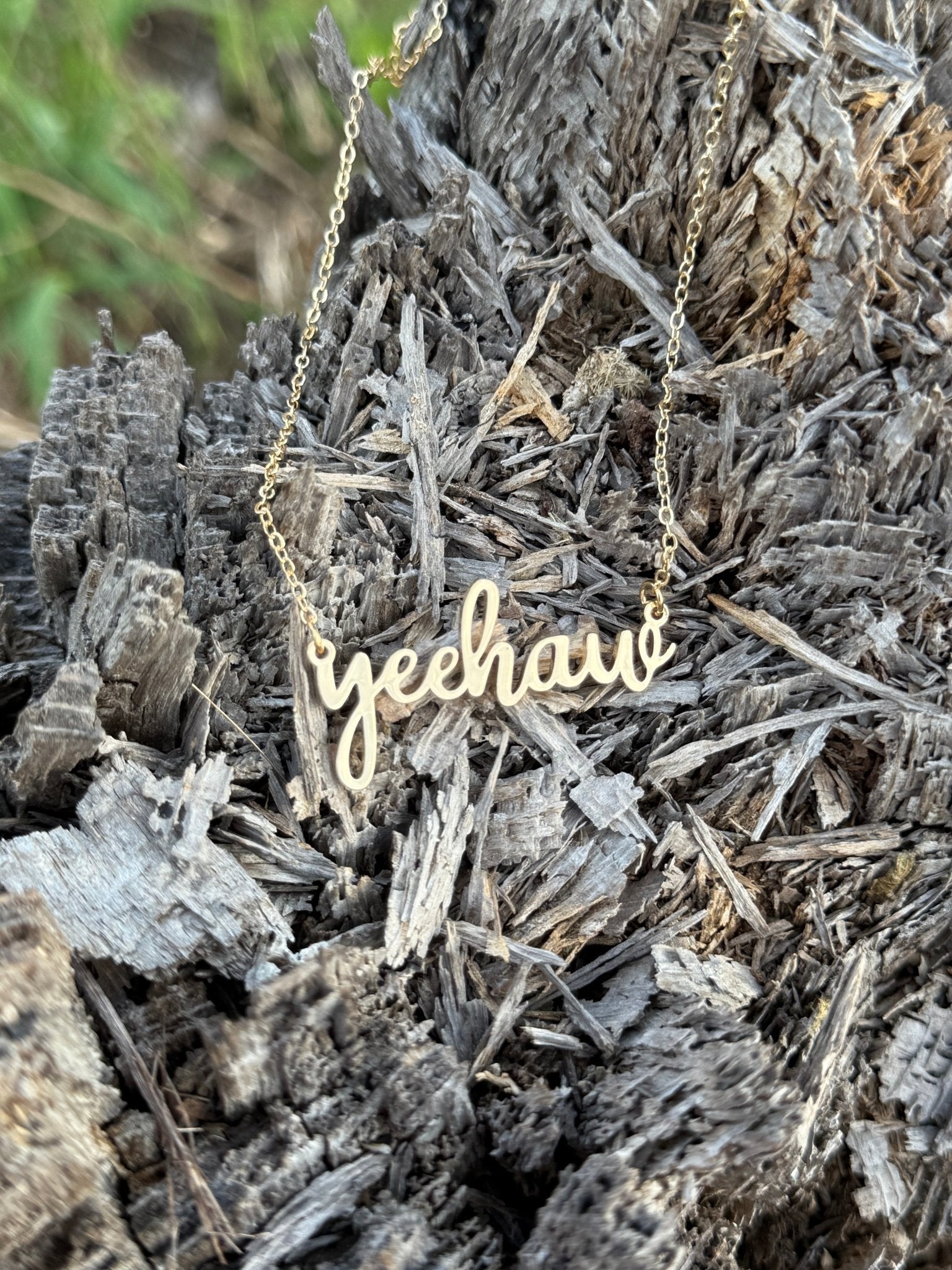 Yee Haw cowgirl, we’ve got the perfect necklace for you! Our Yee Haw Chain Necklace comes in silver cursive lettering. Layer with your favorite turquoise pieces to create a one-of-a-kind look!